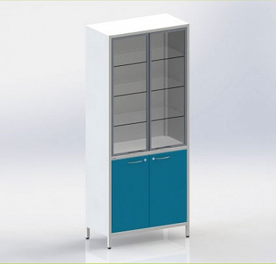 Шкаф двухстворчатый на ножках, верхняя секция с дверками из стекла, 3 стеклянные полочки, регулируемые по высоте. Нижняя секция с металическими дверцами, с замком и металлической полкой.