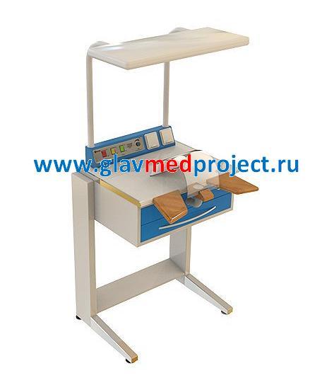 • Стол зубного техника со светильником, полкой, подлокотниками, финагелем с защитным стеклом, двумя розетками и подставкой для ног